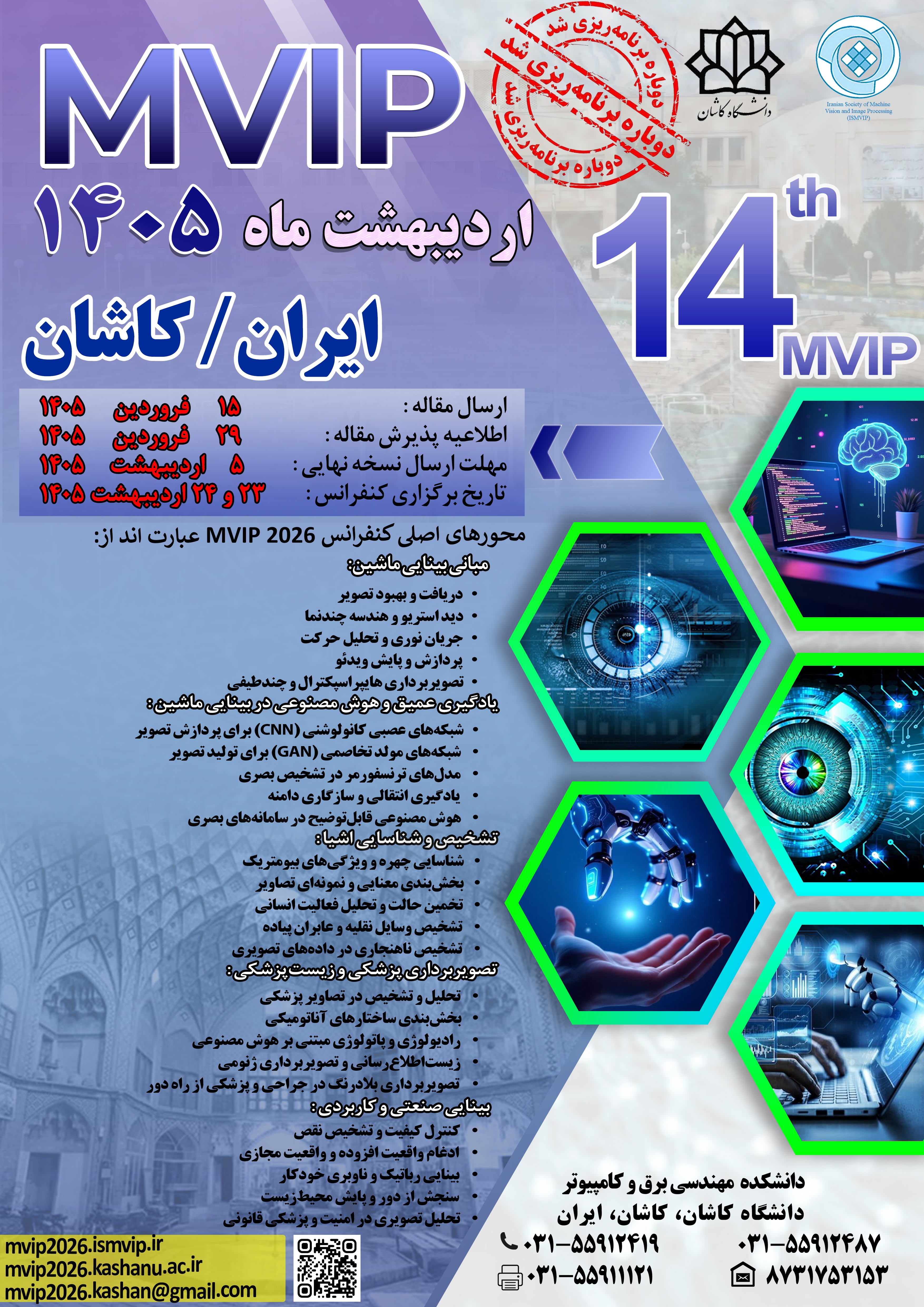 به پیوست فراخوان نهایی و پوستر جدید با تاریخ های تمدید شده کنفرانس MVIP2026 ( چهاردهیمن کنفرانس ملی و چهارمین کنفرانس بین المللی بینایی ماشین و پردازش تصویر) که در 23 و 24 اردیبهشت ماه سال 1405 به میزبانی دانشگاه کاشان و همکاری انجمن بینایی ماشین و پردازش تصویر ایران انجام می شود را خدمت تان ارسال می کنم مستدعی است دستور فرمایید:
